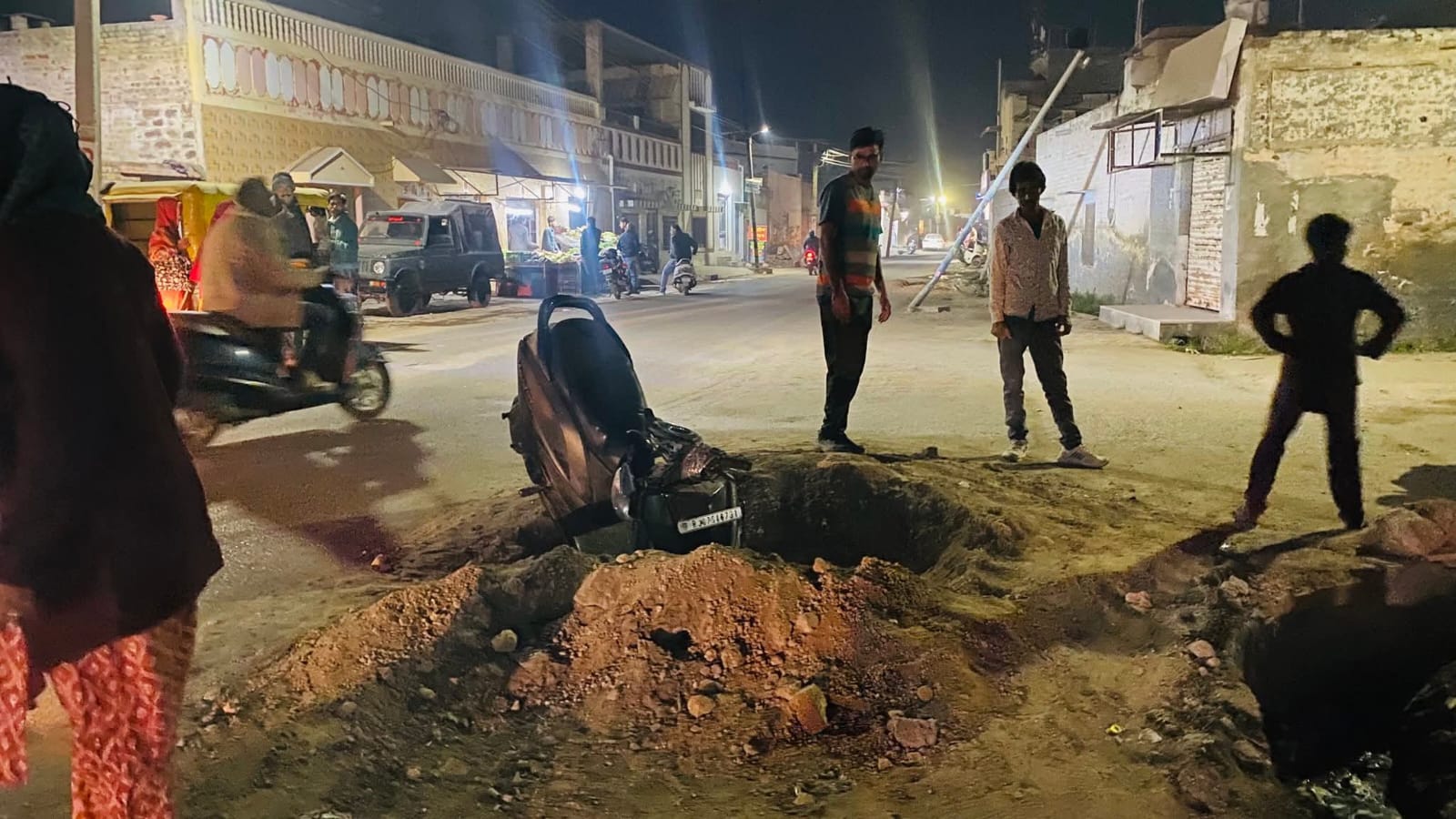बीकानेर, गंगाशहर क्षेत्र के गोपेश्वर मंदिर के पास इन दिनों केबल डाले जाने का काम चल रहा है । केबल बिछाने के लिए सड़क किनारे जगह- जगह गढ़े खोदे जा चुके हैं लेकिन सुरक्षा के उपाय नहीं किए जा रहे, ऐसे में दुर्घटना कारित होने लगी है । गुरुवार को एक बाइक सवार सड़क किनारे खुदे गड्ढे और सेफ्टी उपाय और उजाले के अभाव में गड्ढे में गिर गया । आसपास के लोगों और राहगीरों ने तुरंत उसे बाहर निकाला और अस्पताल पहुंचाया । वहीं बाइक भी क्षतिग्रस्त हो गई । दूसरी ओर स्थानीय लोगों में आक्रोश व्याप्त है ।स्थानीय लोगों का कहना है कि इस तरह की घटना से आदमी मर भी सकते हैं । यह बड़ी लापरवाही है ।